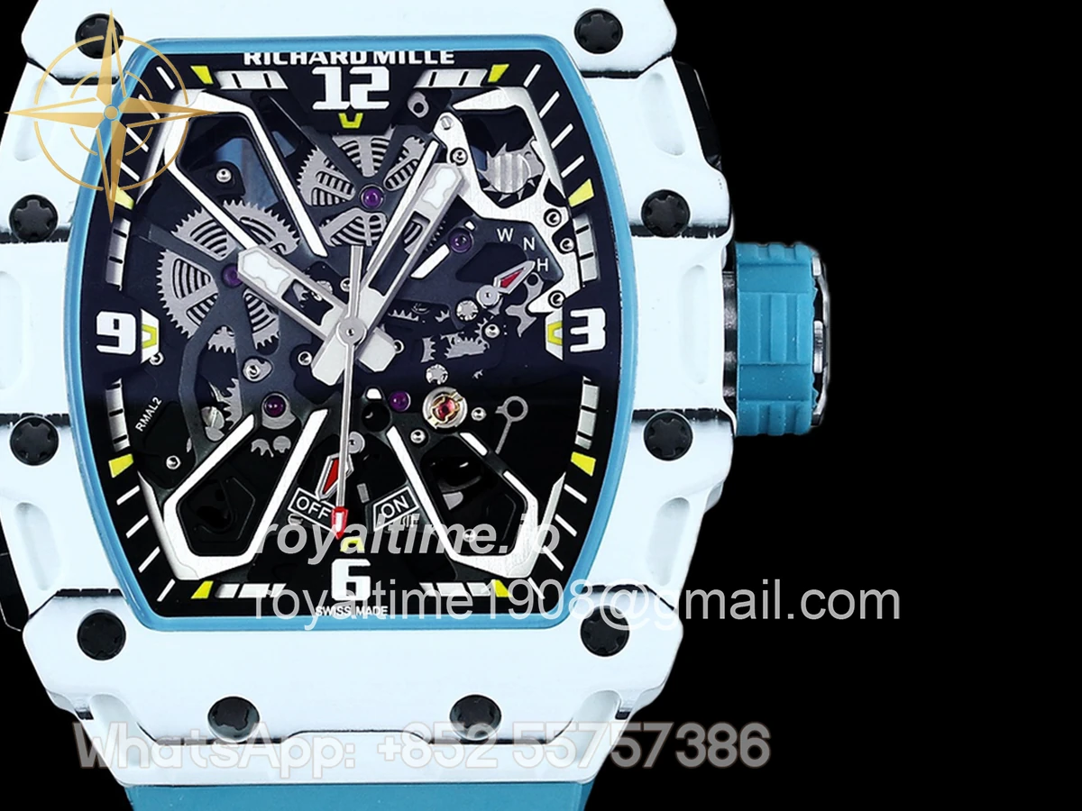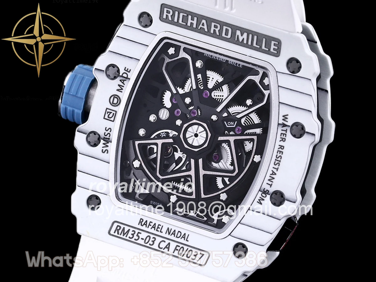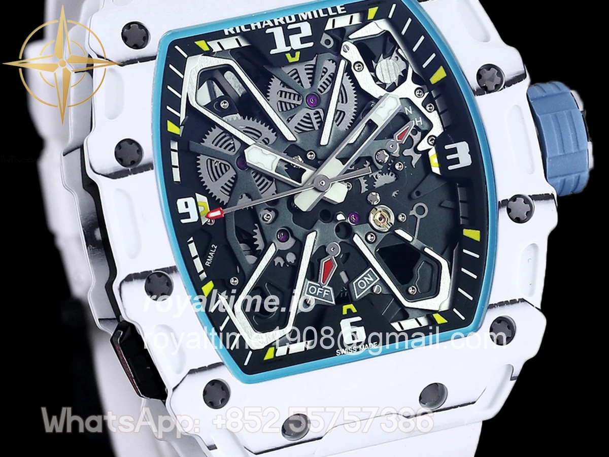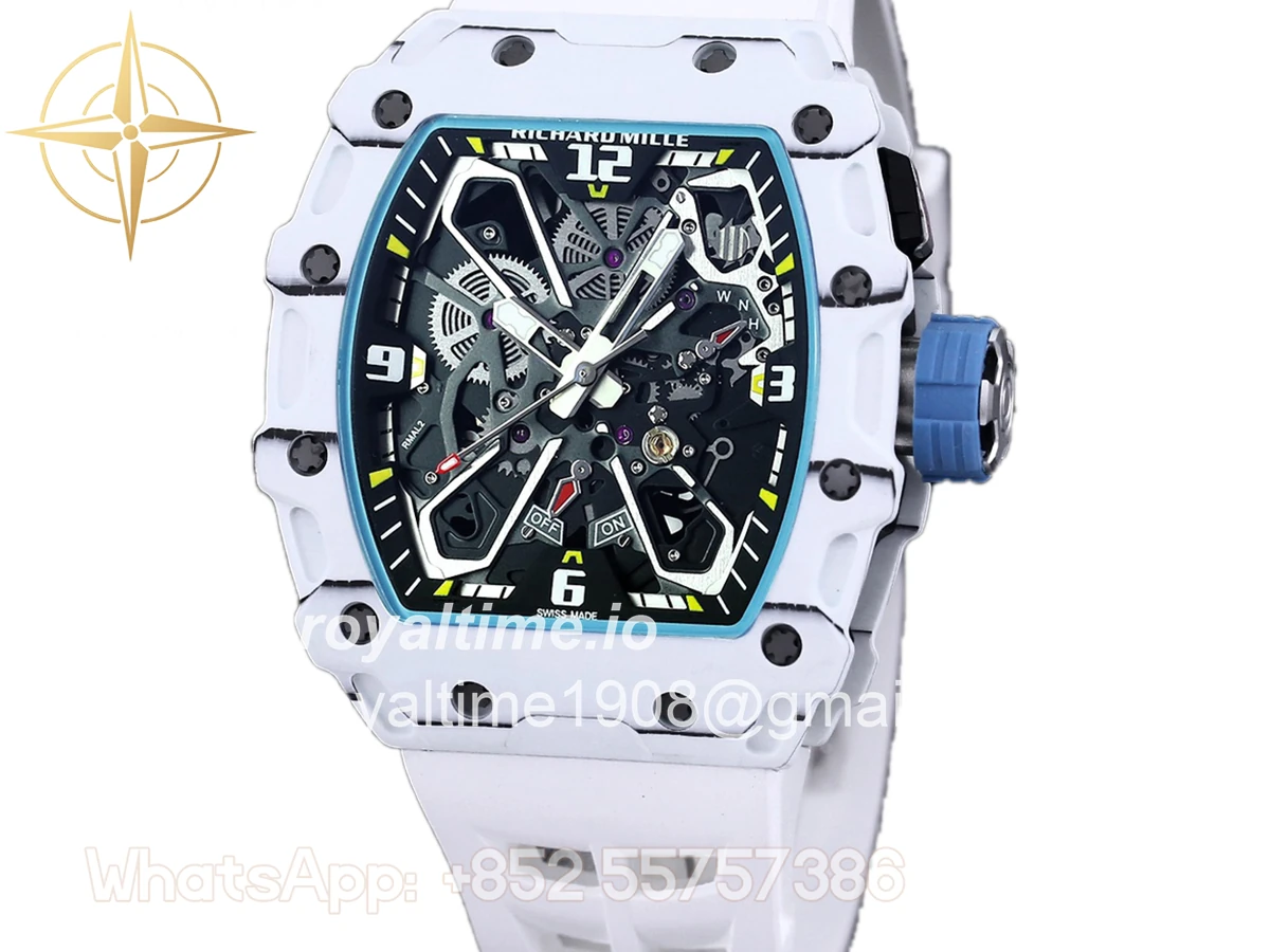 Size: 41.5mm x 50.5mm x 16mm Movement: Japanese MIYOTA 8215 Automatic Movement Functions: Hours, minutes and seconds display Case: White NTPT Carbon / Quartz TPT case Crystal: Scratch-proof sapphire crystal with blue tinted AR Dial: Skeleton dial Bezel: NTPT Carbon / Quartz TPT bezel Strap: Black, Blue, White strap Clasp: Deployment buckle Water resistance: Yes