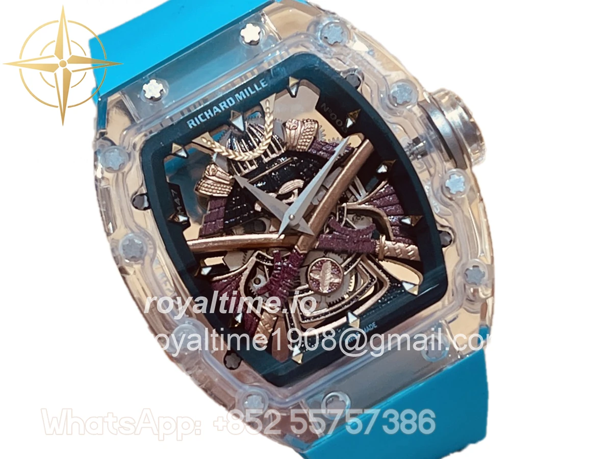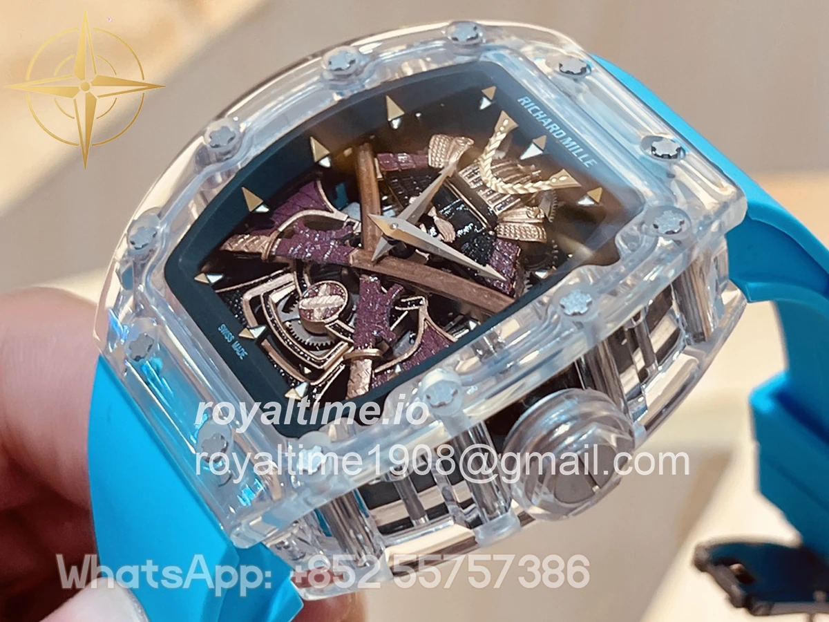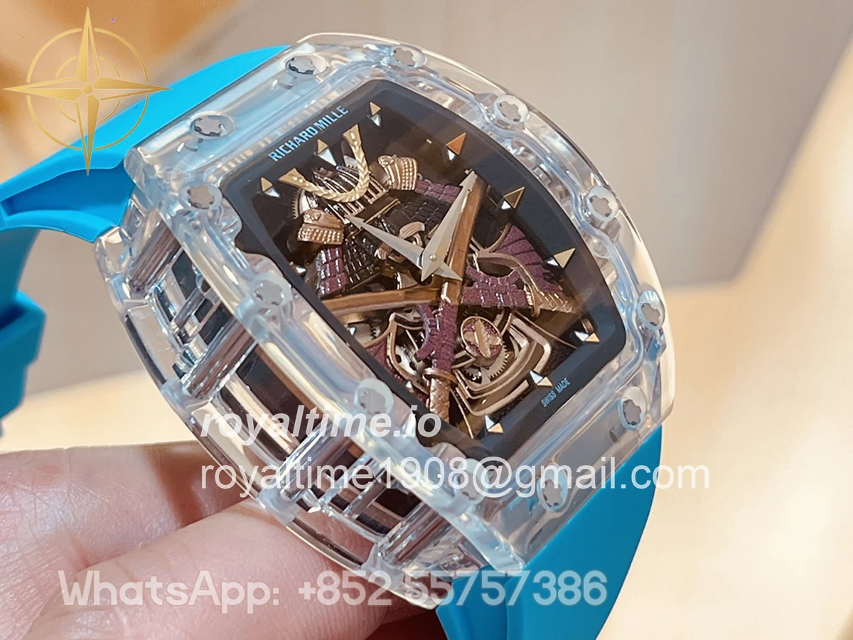 Size: 41mm x 48mm x 13mm Movement: Asian hand winding tourbillon movement Functions: Hours and minutes display Case: Transparent case Crystal: Scratch-proof sapphire crystal Dial: Samurai dial Bezel: Transparent bezel Strap: Blue rubber strap deployant buckle Water resistance: <20 meters