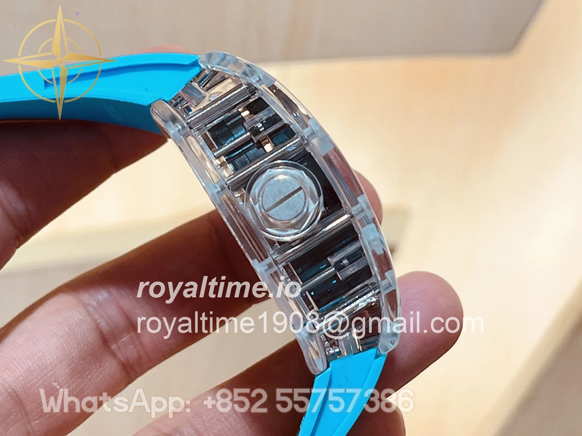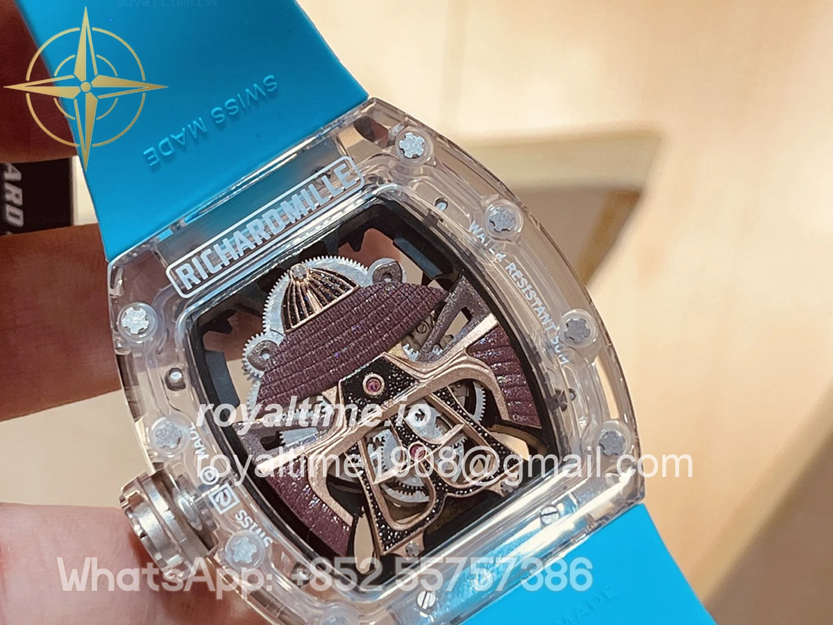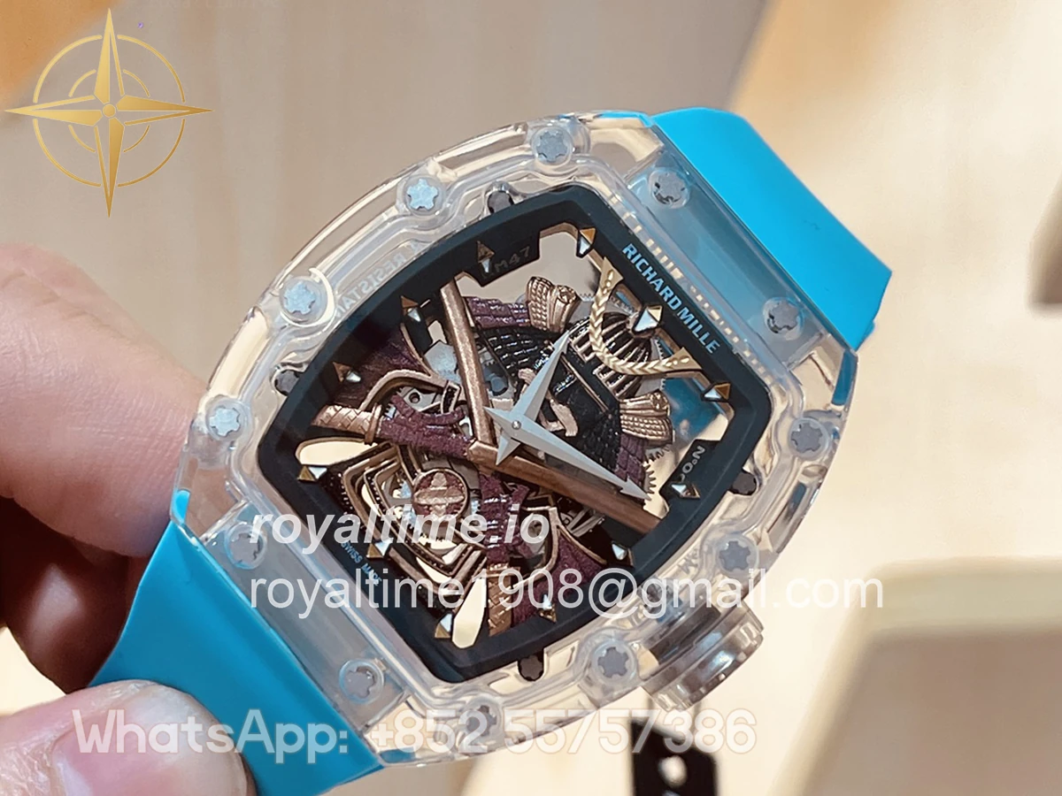 Size: 41mm x 48mm x 13mm Movement: Asian hand winding tourbillon movement Functions: Hours and minutes display Case: Transparent case Crystal: Scratch-proof sapphire crystal Dial: Samurai dial Bezel: Transparent bezel Strap: Blue rubber strap deployant buckle Water resistance: <20 meters