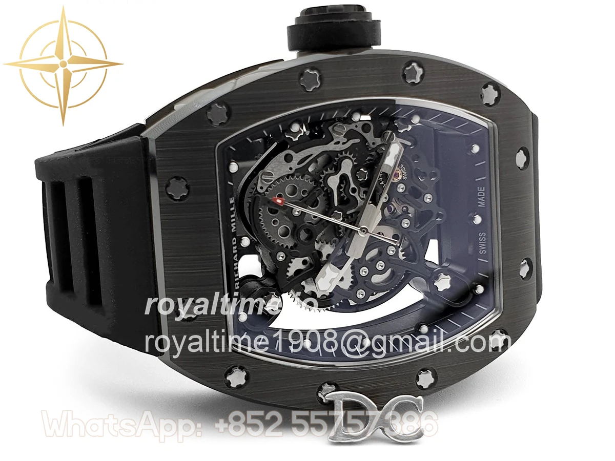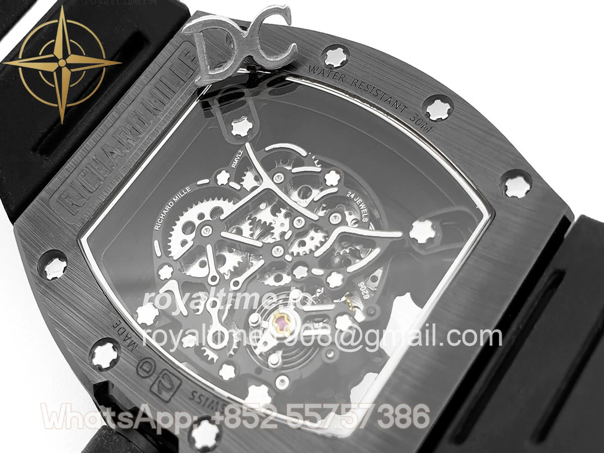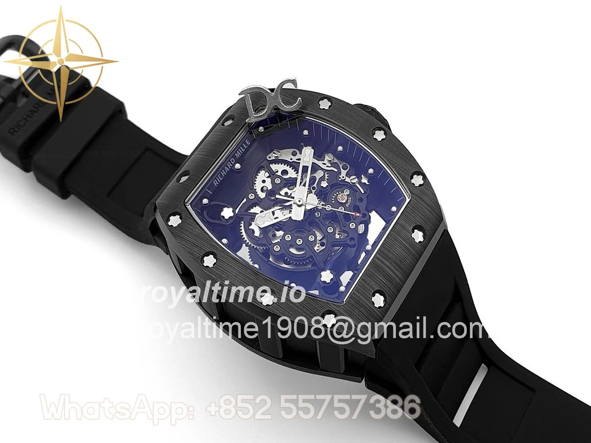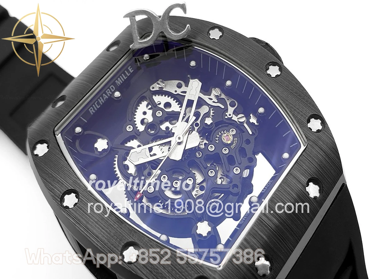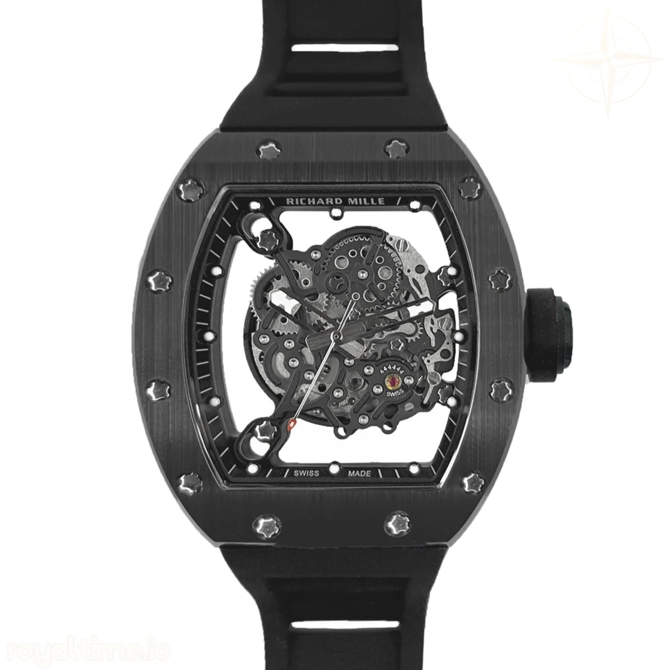 Quality replication of the Richard Mille RM055 Black Bubba Watson. Size: 43mm x 51mm x 18mm Movement: Japanese MIYOTA 9015 Automatic Movement Functions: Hours, minutes and seconds display Case: PVD plated solid 316L stainless steel case Crystal: Scratch-proof sapphire crystal Dial: Skeleton dial Bezel: PVD plated solid 316L stainless steel bezel Strap: Black rubber strap Clasp: Deployant clasp Water resistance: >50 Meters