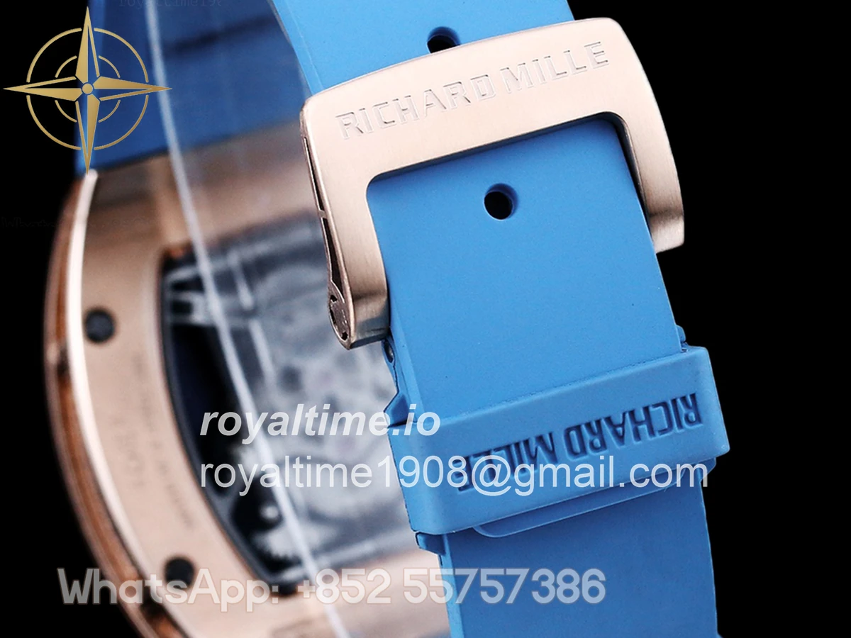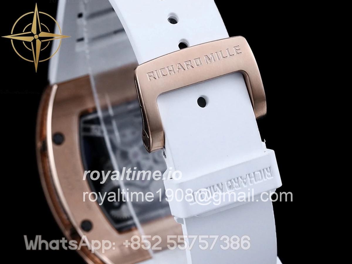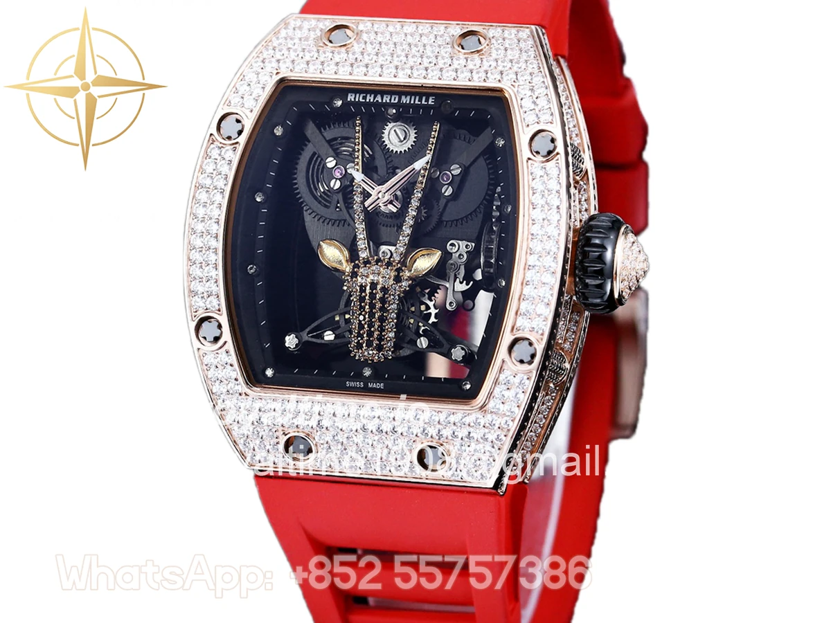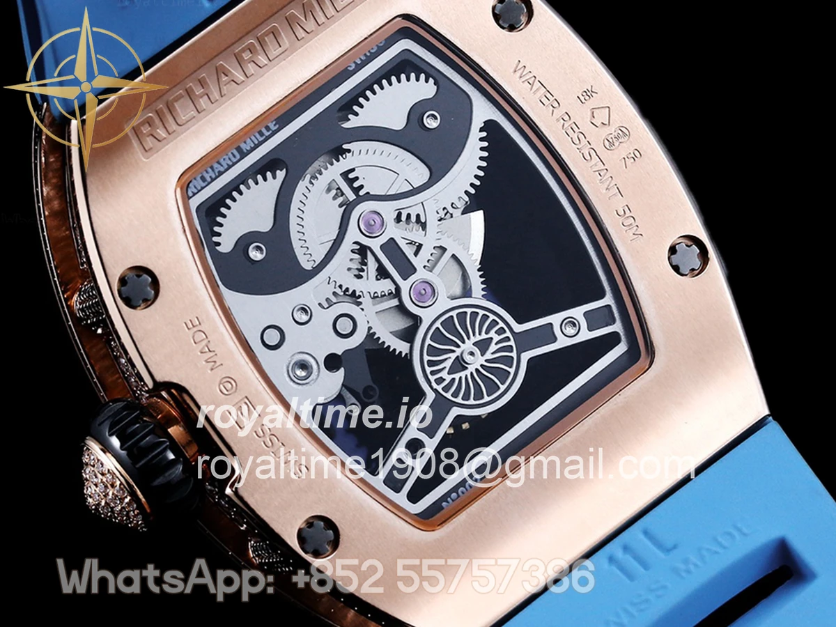Size: 43mm x 51mm x 17mm Movement: Japanese MIYOTA 8215 automatic movement at 21600vph Functions: Hours and minutes display Case: Rose gold plated solid stainless steel case Crystal: Scratch-proof sapphire crystal with AR coating Dial: Skeleton dial Bezel: 18K Rose Gold Plated Solid 316L stainless steel with diamond bezel Strap: Rubber strap (Black, Blue, Orange, Red, White) Clasp: Deployant clasp Water resistance: <30 Meters