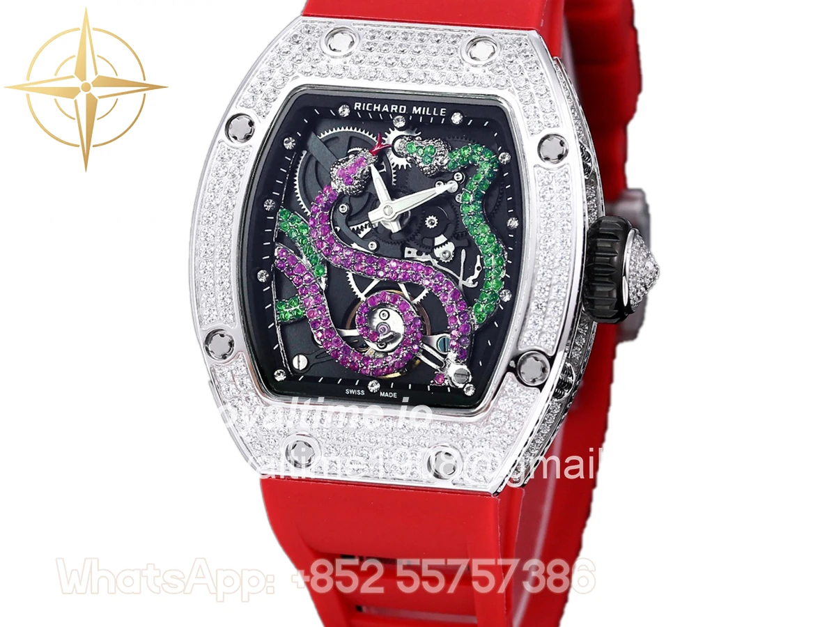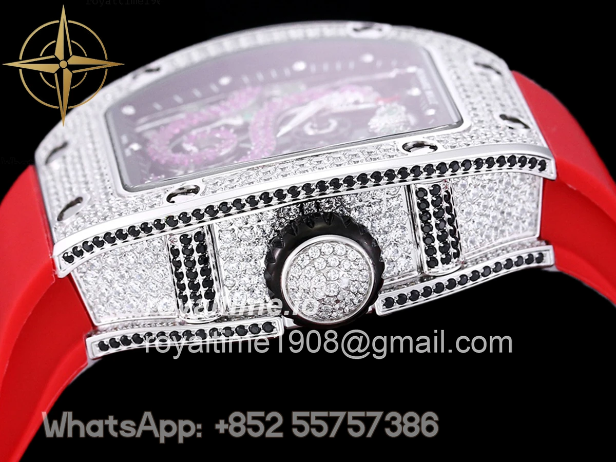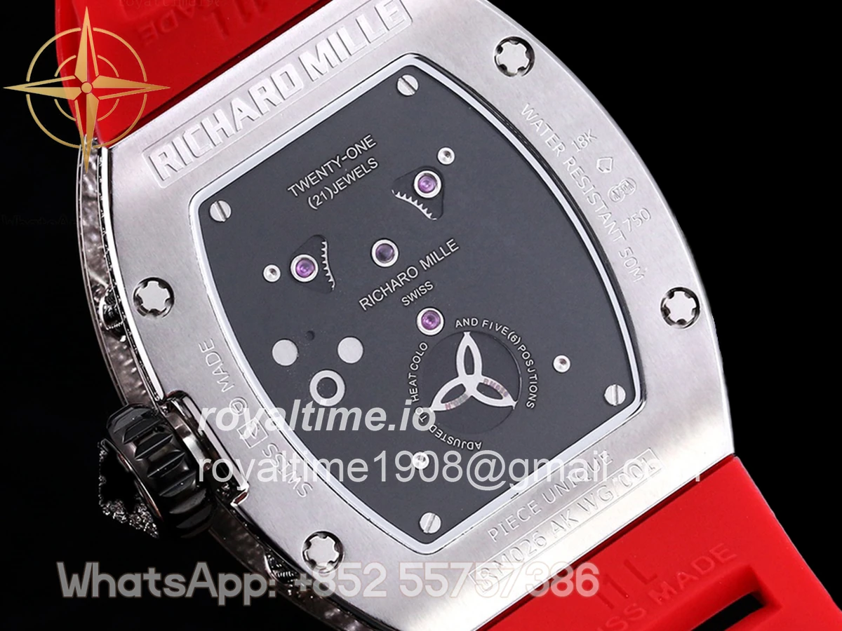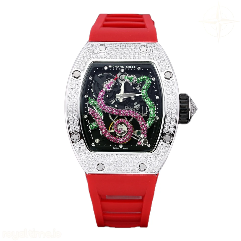 Size: 43mm x 51mm x 17mm Movement: Japanese MIYOTA 8215 automatic movement at 21600vph Functions: Hours, minutes and seconds display Case: Solid stainless steel case Crystal: Scratch-proof sapphire crystal with AR coating Dial: Skeleton dial Bezel: Solid 316L stainless steel with diamond bezel Strap: Rubber strap (Black, Red, White) Clasp: Deployant clasp Water resistance: <30 Meters