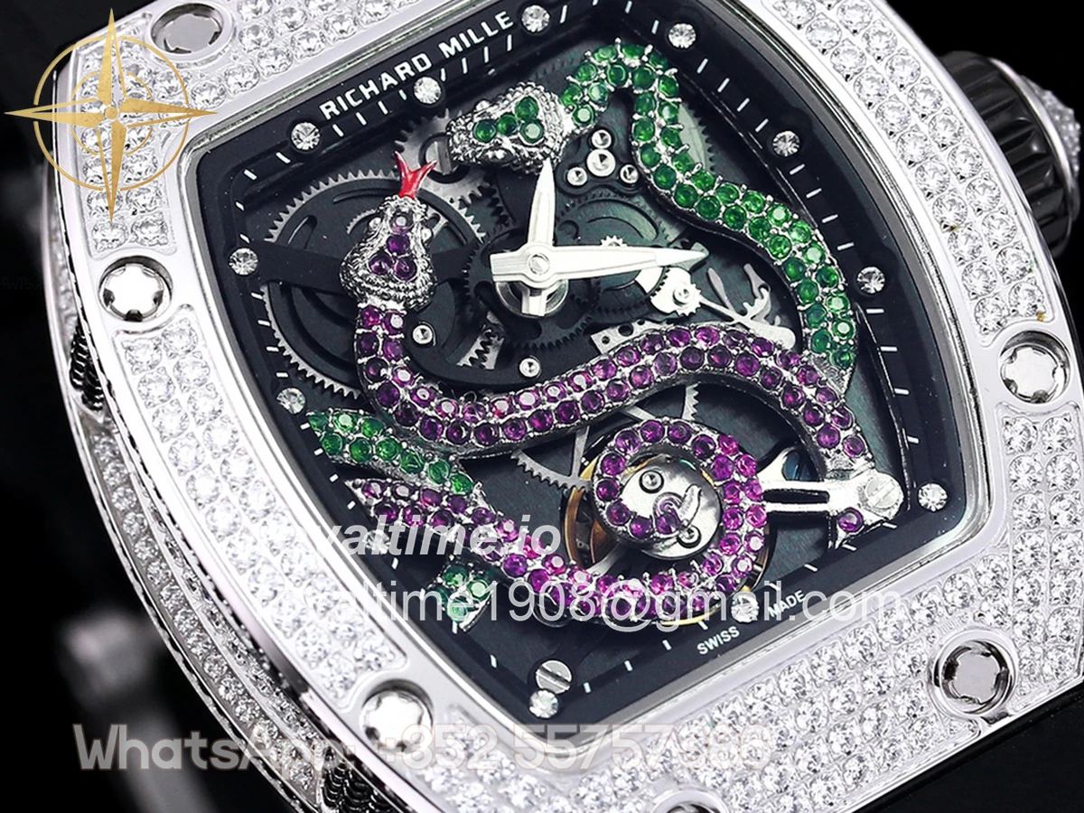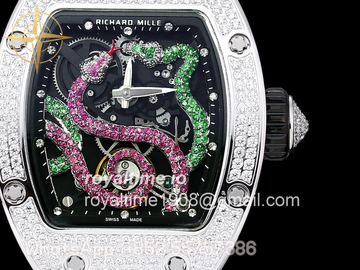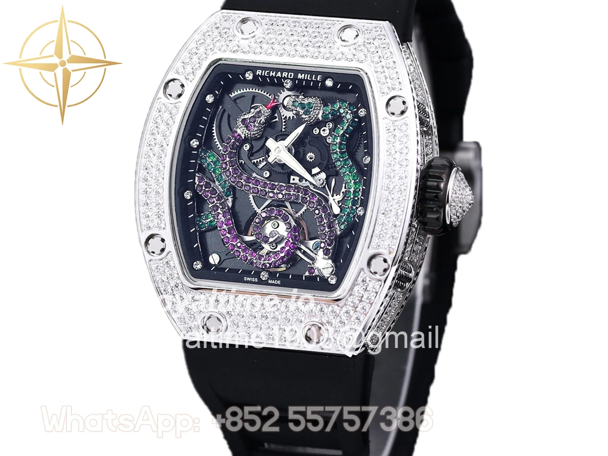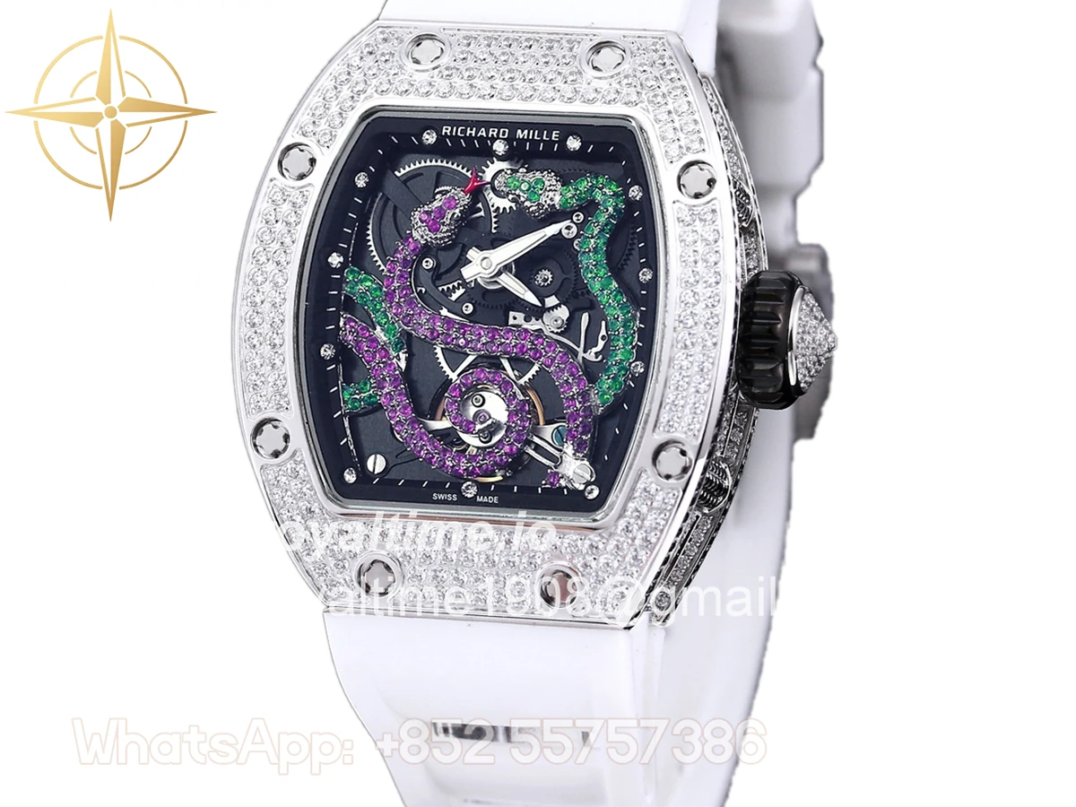Size: 43mm x 51mm x 17mm Movement: Japanese MIYOTA 8215 automatic movement at 21600vph Functions: Hours, minutes and seconds display Case: Solid stainless steel case Crystal: Scratch-proof sapphire crystal with AR coating Dial: Skeleton dial Bezel: Solid 316L stainless steel with diamond bezel Strap: Rubber strap (Black, Red, White) Clasp: Deployant clasp Water resistance: <30 Meters
