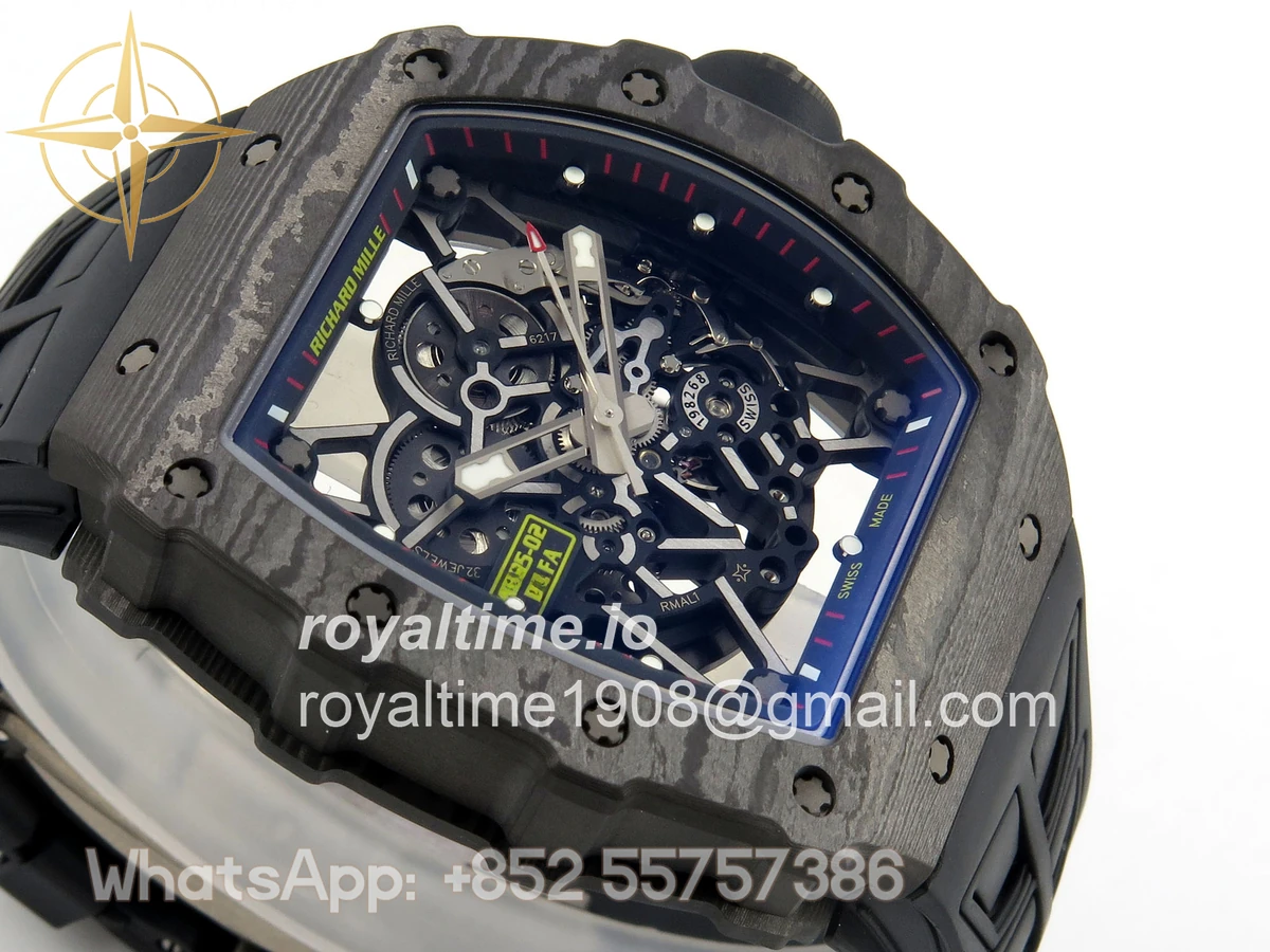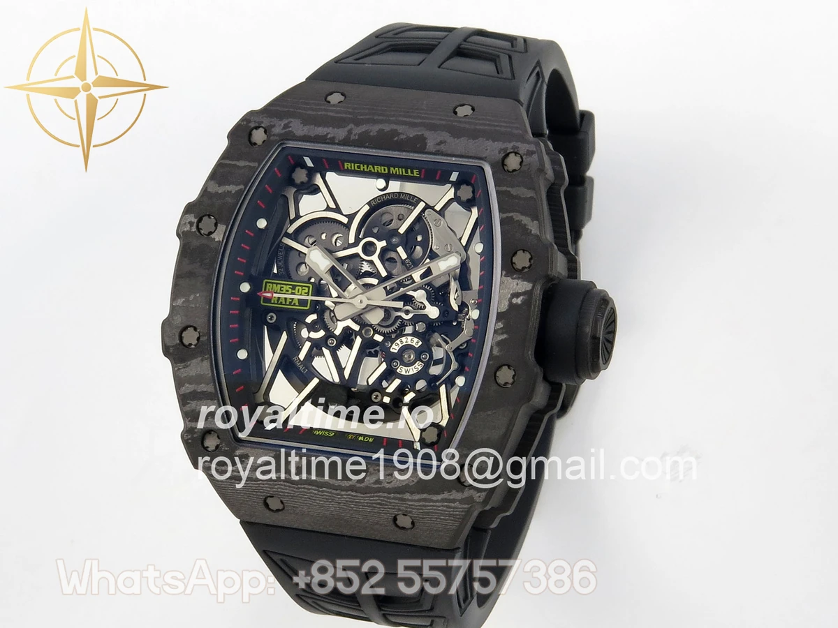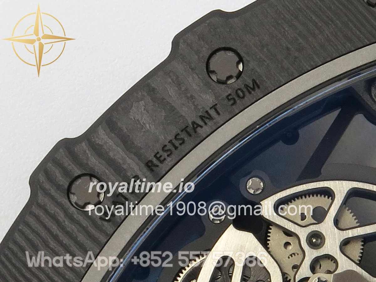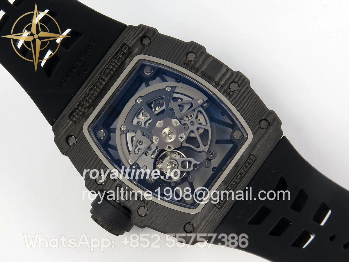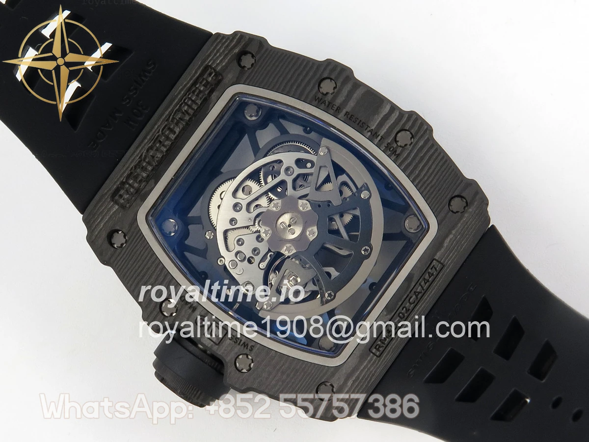 Size 44.5mm x 50mm x 13.2mm (exactly the same as genuine) Movement Free Sprung asian custom made super clone RMAL1 automatic movement, same as genuine Functions Hours, minutes and seconds display Case Black NTPT case with unique pattern Crystal Scratch-proof sapphire crystal with AR coating Dial Skeleton dial Bezel Black NTPT carbon bezel Strap Black rubber strap Clasp Deployant clasp Water resistance >50 Meters Please be informed that this rating is merely a guide. We do do not advise submerging or immersing any replica watch in water unless you have had your watch water-proofed by a professional. We do not guarantee the product’s water-resistance and as such we do not refund, offer store credit, exchange or do a free repair on any watch that has water damage.