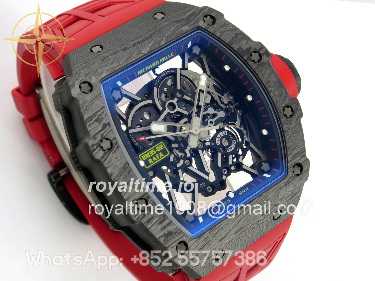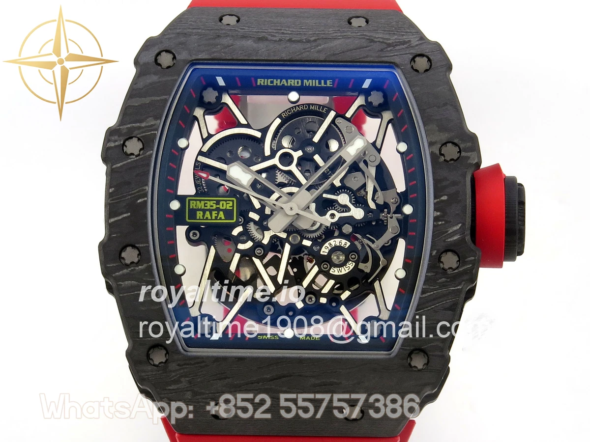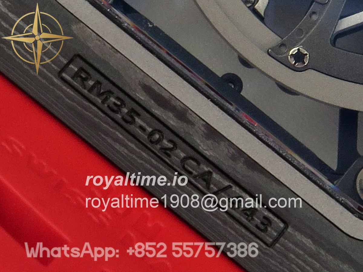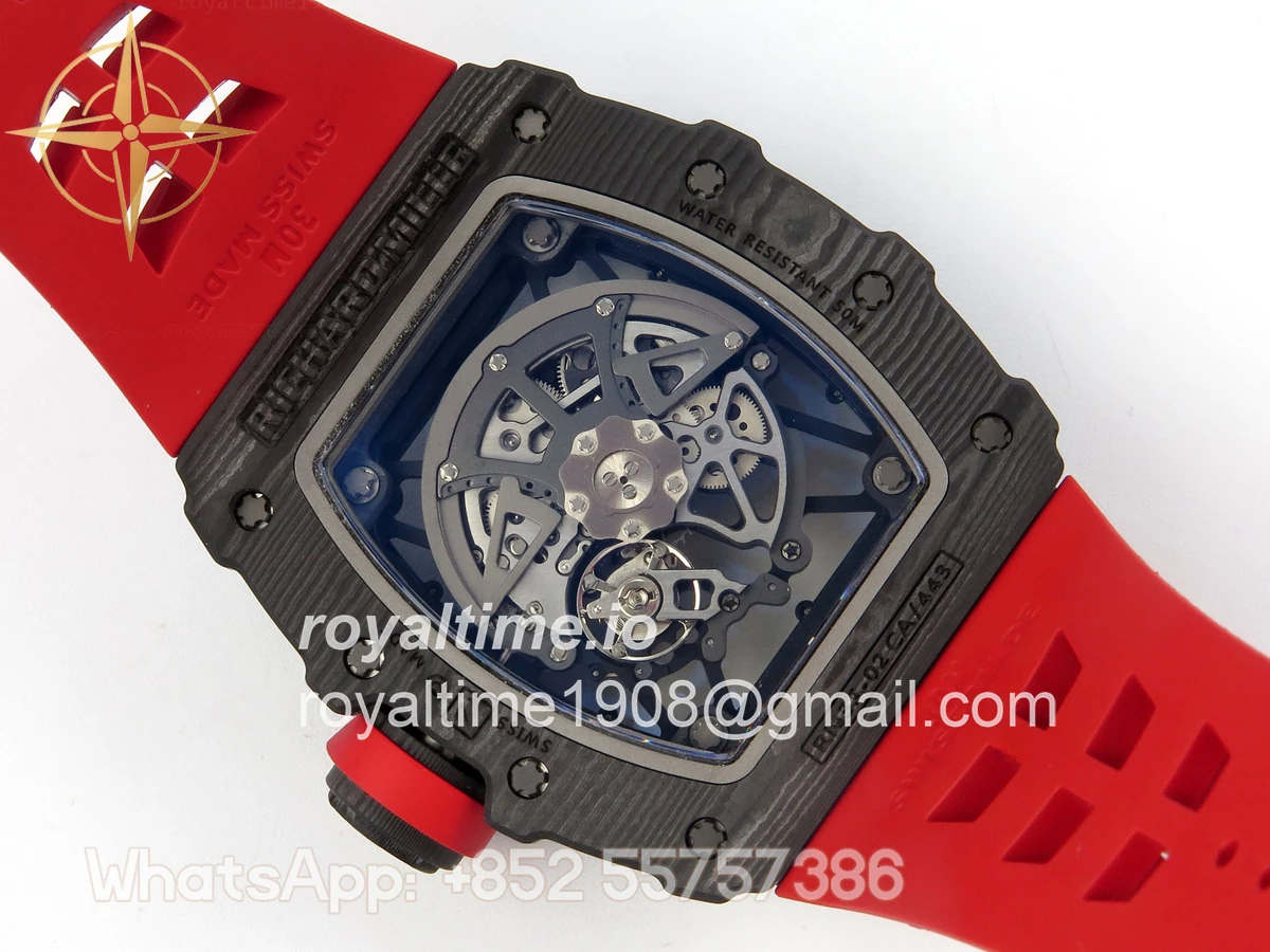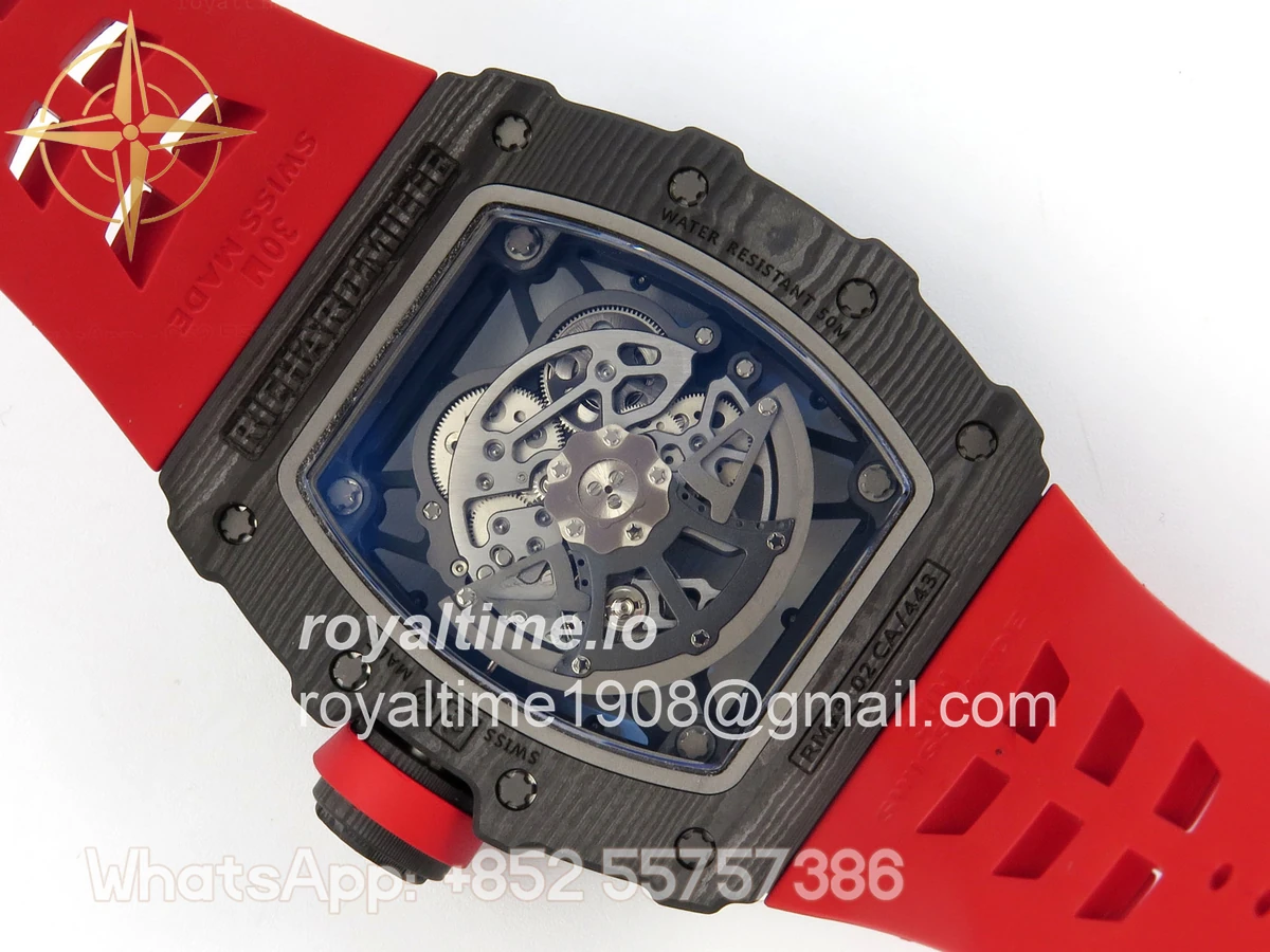 Size 44.5mm x 50mm x 13.2mm (exactly the same as genuine) Movement Free Sprung asian custom made super clone RMAL1 automatic movement, same as genuine Functions Hours, minutes and seconds display Case Black NTPT case with unique pattern Crystal Scratch-proof sapphire crystal with AR coating Dial Skeleton dial Bezel Black NTPT carbon bezel Strap Red rubber strap Clasp Deployant clasp Water resistance >50 Meters Please be informed that this rating is merely a guide. We do do not advise submerging or immersing any replica watch in water unless you have had your watch water-proofed by a professional. We do not guarantee the product’s water-resistance and as such we do not refund, offer store credit, exchange or do a free repair on any watch that has water damage.