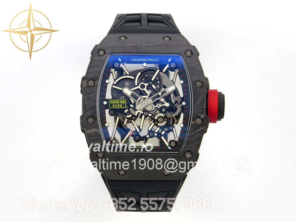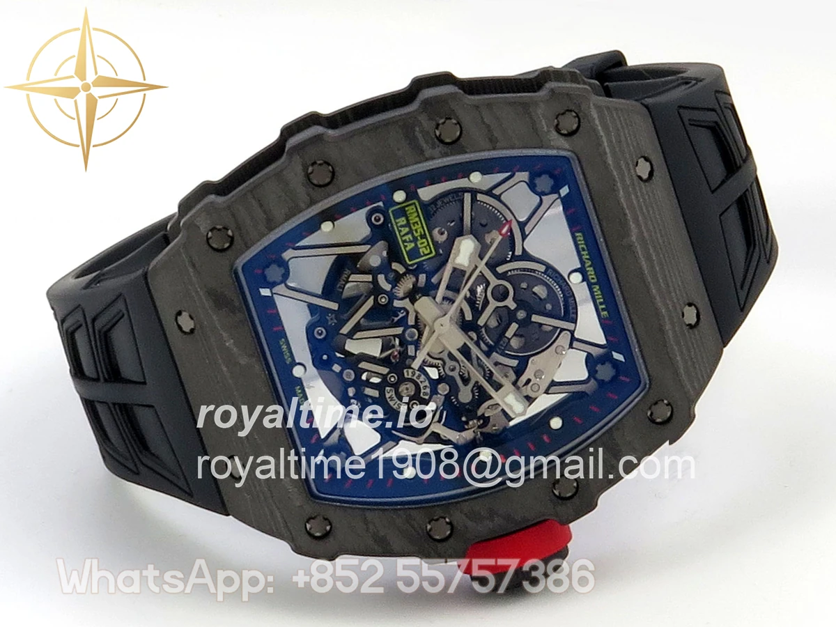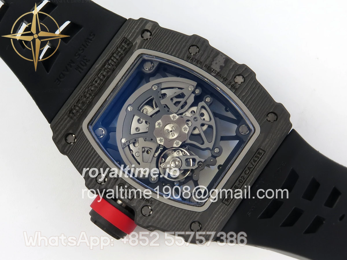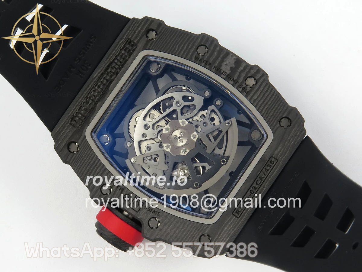 Size 44.5mm x 50mm x 13.2mm (exactly the same as genuine) Movement Free Sprung asian custom made super clone RMAL1 automatic movement, same as genuine Functions Hours, minutes and seconds display Case Black NTPT case with unique pattern Crystal Scratch-proof sapphire crystal with AR coating Dial Skeleton dial Bezel Black NTPT carbon bezel Strap Black rubber strap Clasp Deployant clasp Water resistance >50 Meters Please be informed that this rating is merely a guide. We do do not advise submerging or immersing any replica watch in water unless you have had your watch water-proofed by a professional. We do not guarantee the product’s water-resistance and as such we do not refund, offer store credit, exchange or do a free repair on any watch that has water damage.