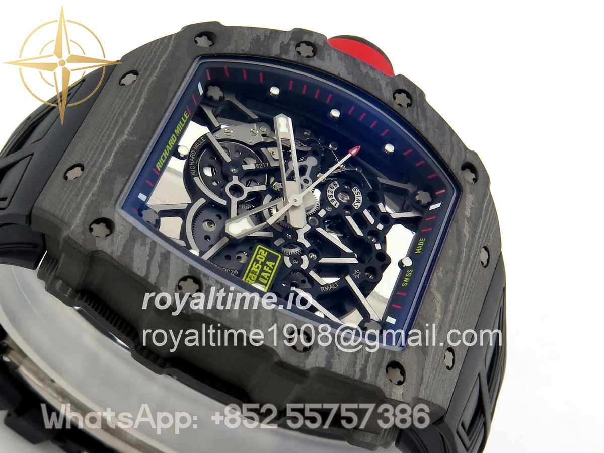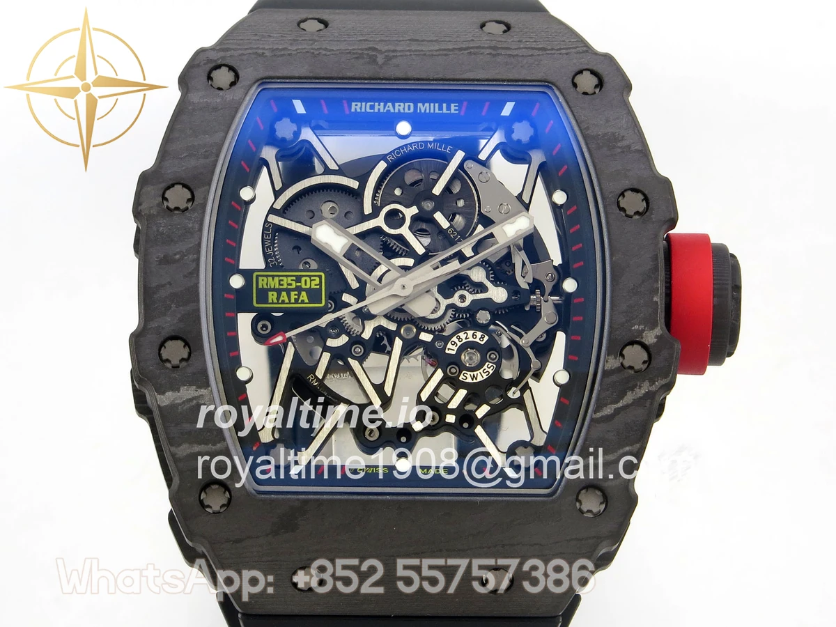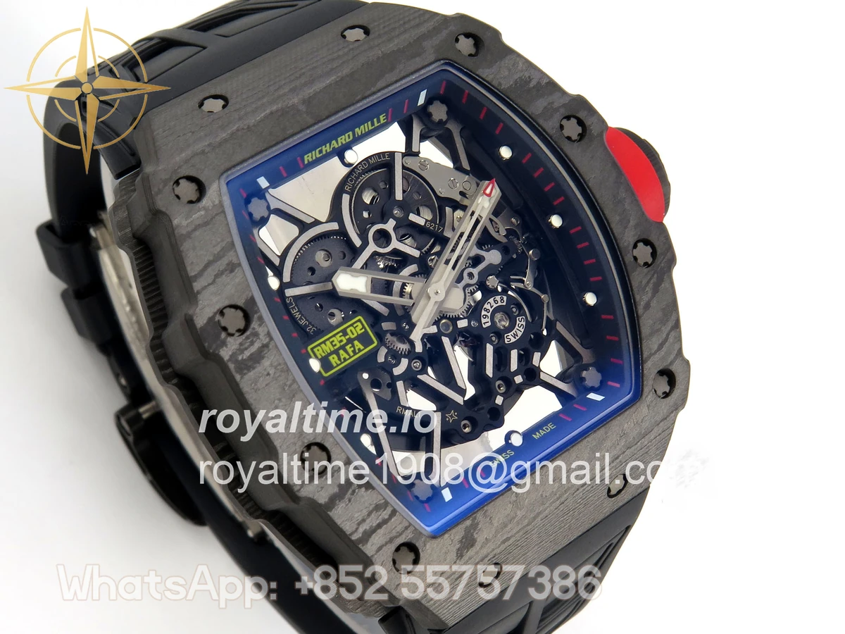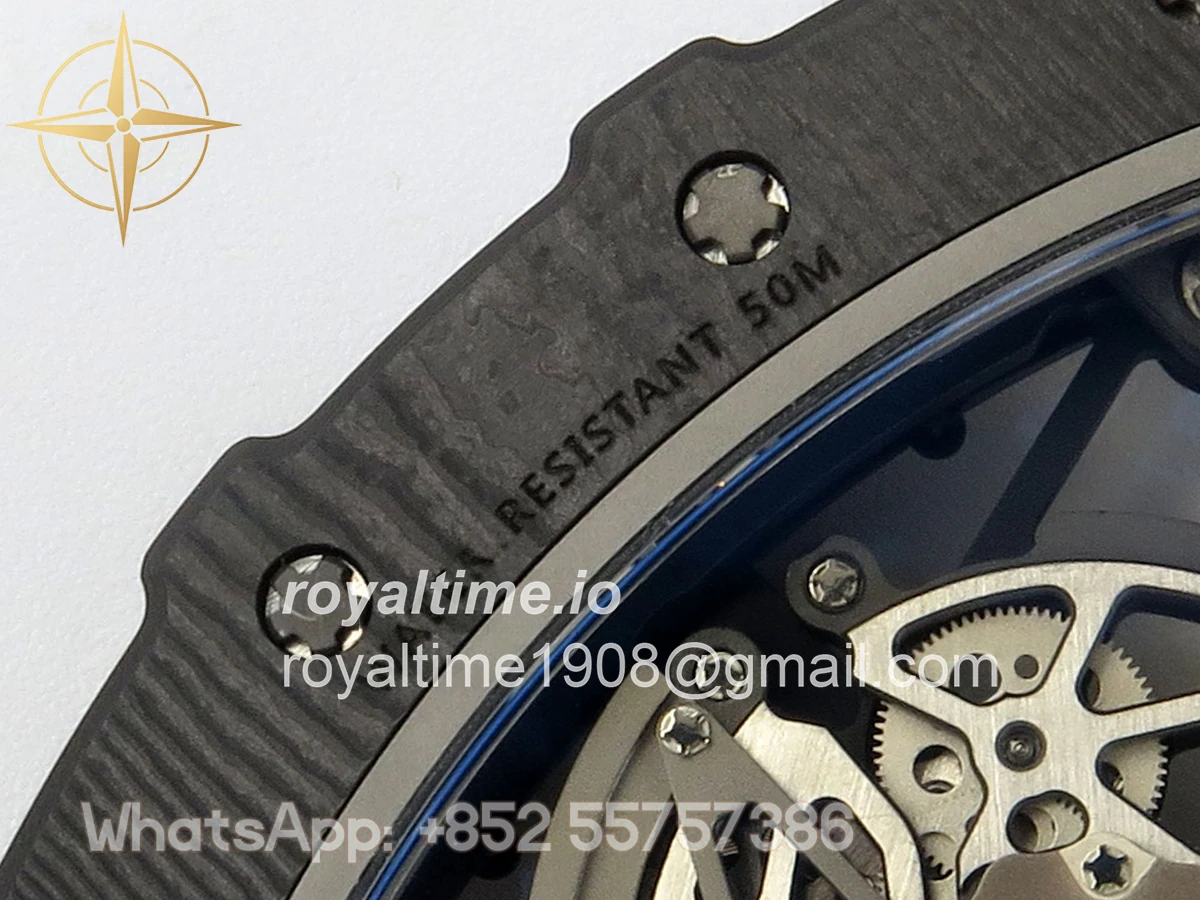 Size 44.5mm x 50mm x 13.2mm (exactly the same as genuine) Movement Free Sprung asian custom made super clone RMAL1 automatic movement, same as genuine Functions Hours, minutes and seconds display Case Black NTPT case with unique pattern Crystal Scratch-proof sapphire crystal with AR coating Dial Skeleton dial Bezel Black NTPT carbon bezel Strap Black rubber strap Clasp Deployant clasp Water resistance >50 Meters Please be informed that this rating is merely a guide. We do do not advise submerging or immersing any replica watch in water unless you have had your watch water-proofed by a professional. We do not guarantee the product’s water-resistance and as such we do not refund, offer store credit, exchange or do a free repair on any watch that has water damage.