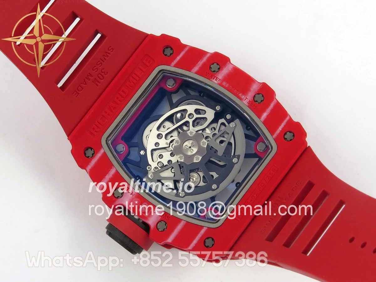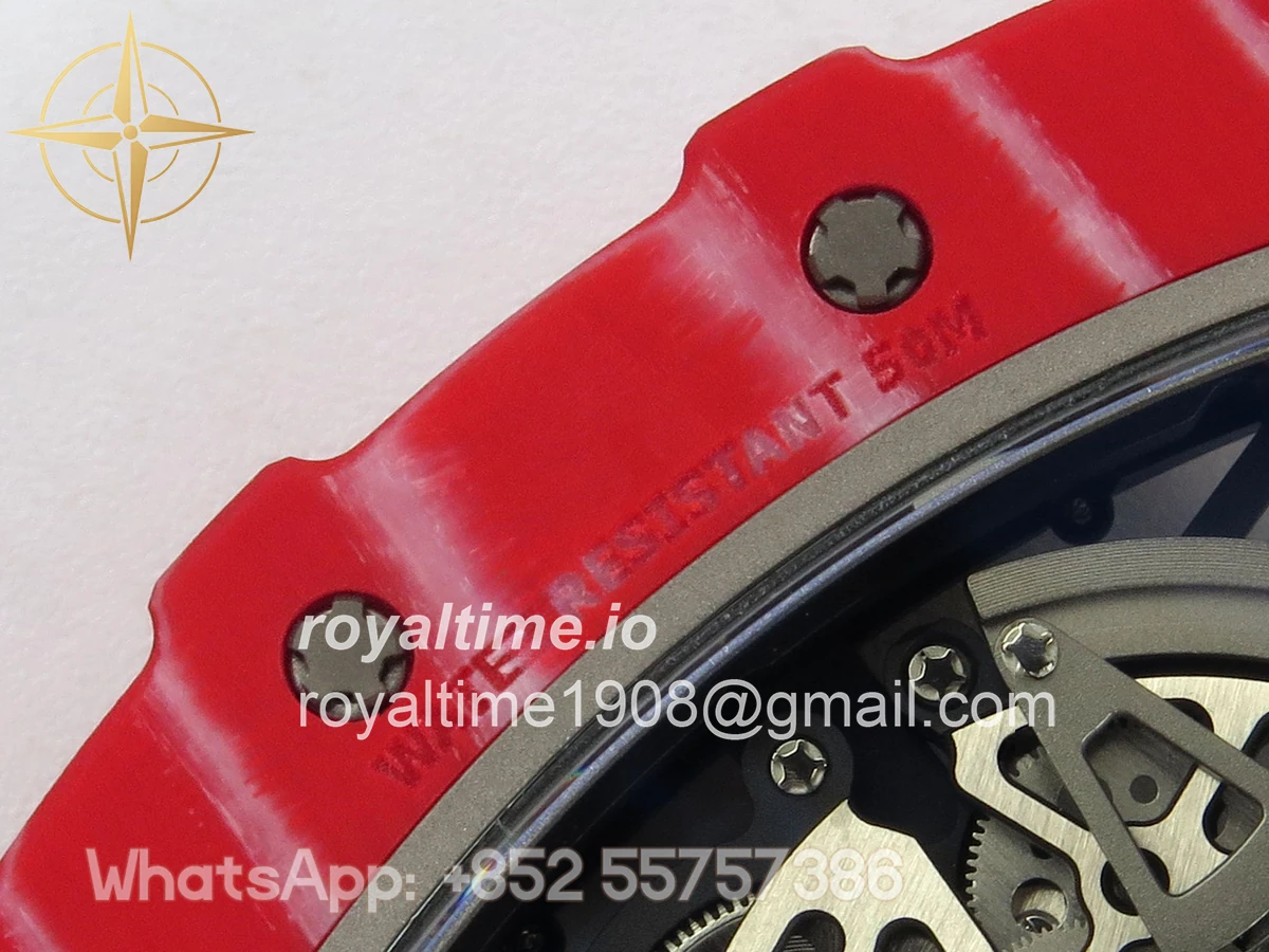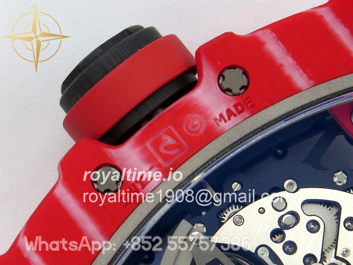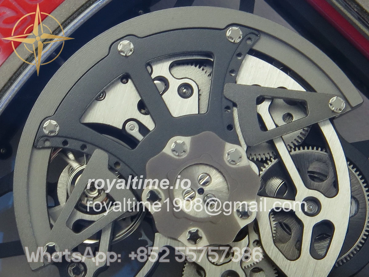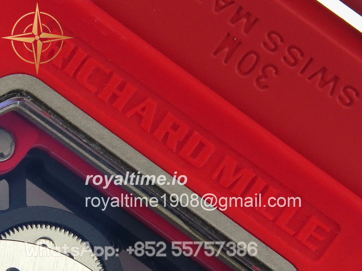 Size 44.5mm x 50mm x 13.2mm (exactly the same as genuine) Movement Asian super clone RMAL1 skeleton movement, the best asian RMAL1 movement at the moment, same looking as genuine. Functions Hours, minutes and seconds display Case 1:1 made real NTPT material bezel, case crown and caseback, not PVD plated or metals. The screws and other parts are interchangeable with genuine watch part. Crystal Super clear scratch-proof sapphire crystal with correct color purple AR coating, same shape and size as genuine watch, can be replaced with genuine watch parts. Dial Skeleton dial Bezel Real NTPT carbon bezel with glossy finish, unique pattern on each bezel. The NTPT texture reflaction is same as genuine. Strap High quality red rubber strap, same quality as genuine strap, interchangeable with genuine watch strap Clasp Super high quality deployment clasp, almost same as genuine clasp Water resistance >50 Meters Please be informed that this rating is merely a guide. We do do not advise submerging or immersing any replica watch in water unless you have had your watch water-proofed by a professional. We do not guarantee the product’s water-resistance and as such we do not refund, offer store credit, exchange or do a free repair on any watch that has water damage.