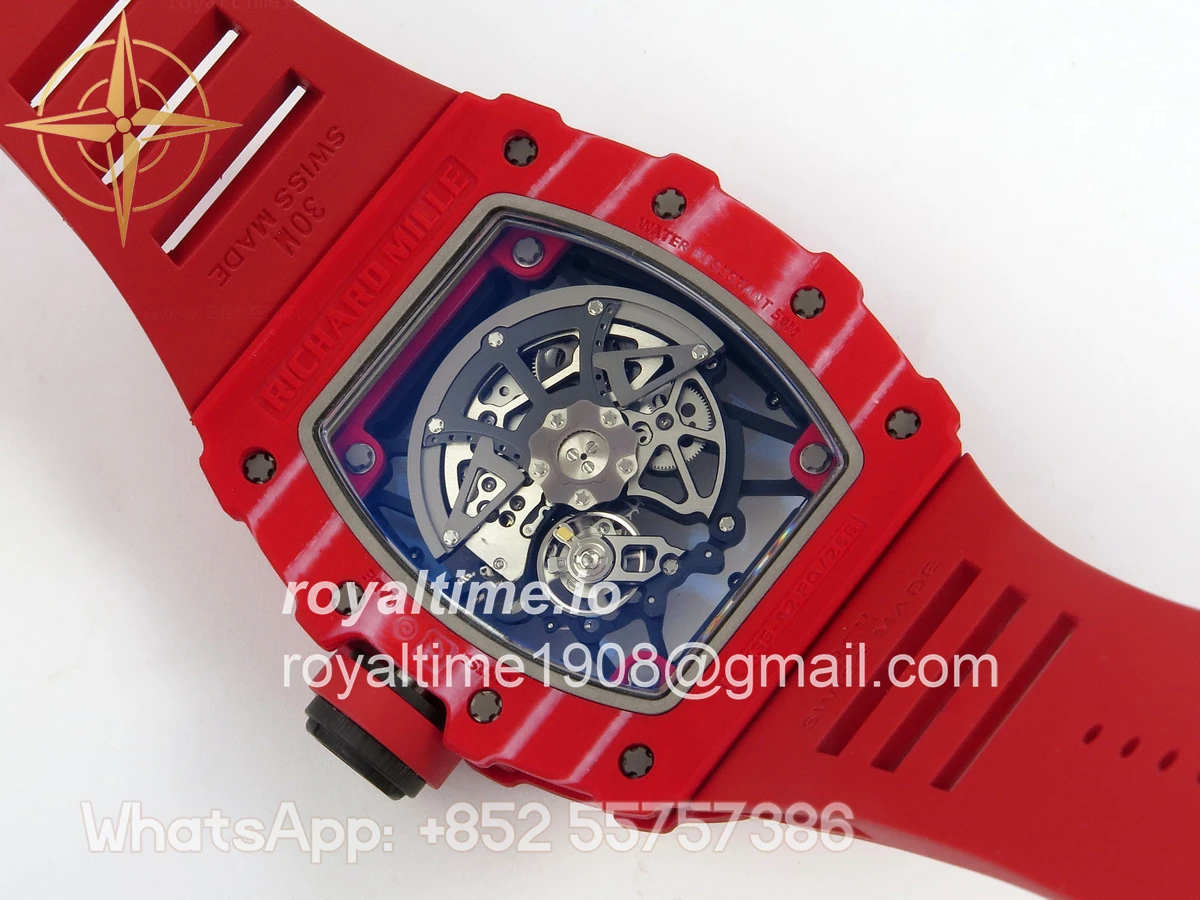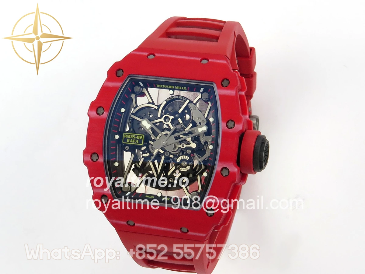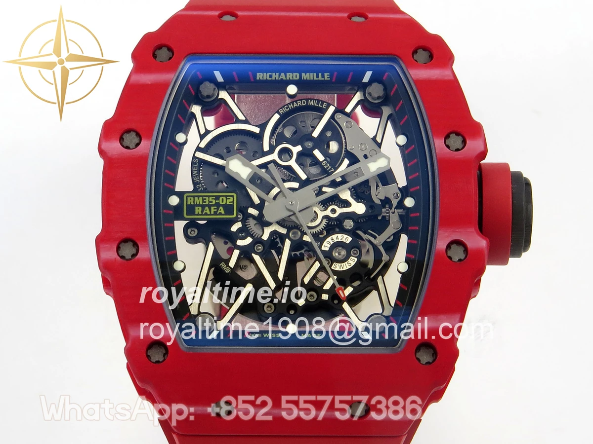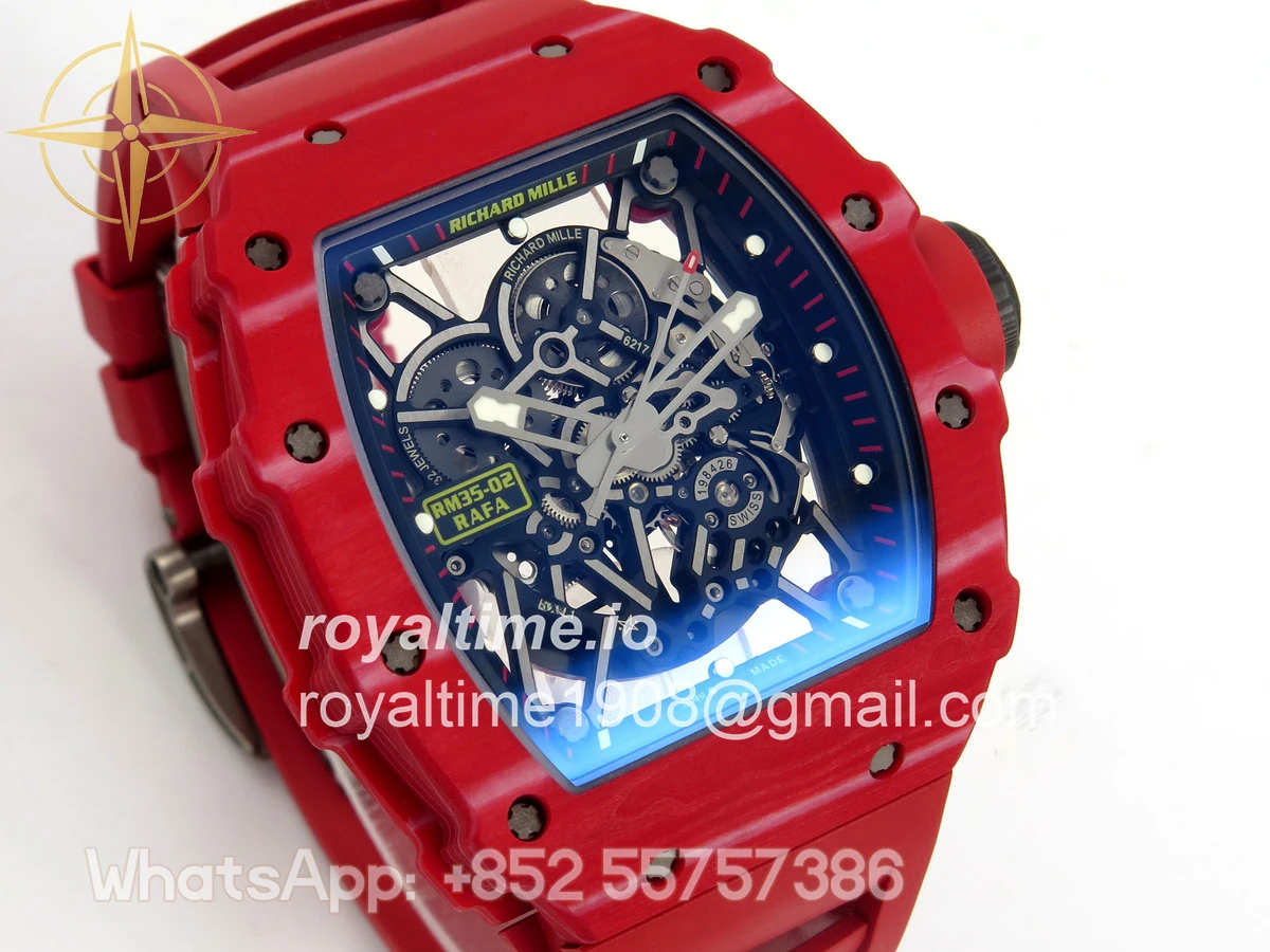 Size 44.5mm x 50mm x 13.2mm (exactly the same as genuine) Movement Asian super clone RMAL1 skeleton movement, the best asian RMAL1 movement at the moment, same looking as genuine. Functions Hours, minutes and seconds display Case 1:1 made real NTPT material bezel, case crown and caseback, not PVD plated or metals. The screws and other parts are interchangeable with genuine watch part. Crystal Super clear scratch-proof sapphire crystal with correct color purple AR coating, same shape and size as genuine watch, can be replaced with genuine watch parts. Dial Skeleton dial Bezel Real NTPT carbon bezel with glossy finish, unique pattern on each bezel. The NTPT texture reflaction is same as genuine. Strap High quality red rubber strap, same quality as genuine strap, interchangeable with genuine watch strap Clasp Super high quality deployment clasp, almost same as genuine clasp Water resistance >50 Meters Please be informed that this rating is merely a guide. We do do not advise submerging or immersing any replica watch in water unless you have had your watch water-proofed by a professional. We do not guarantee the product’s water-resistance and as such we do not refund, offer store credit, exchange or do a free repair on any watch that has water damage.